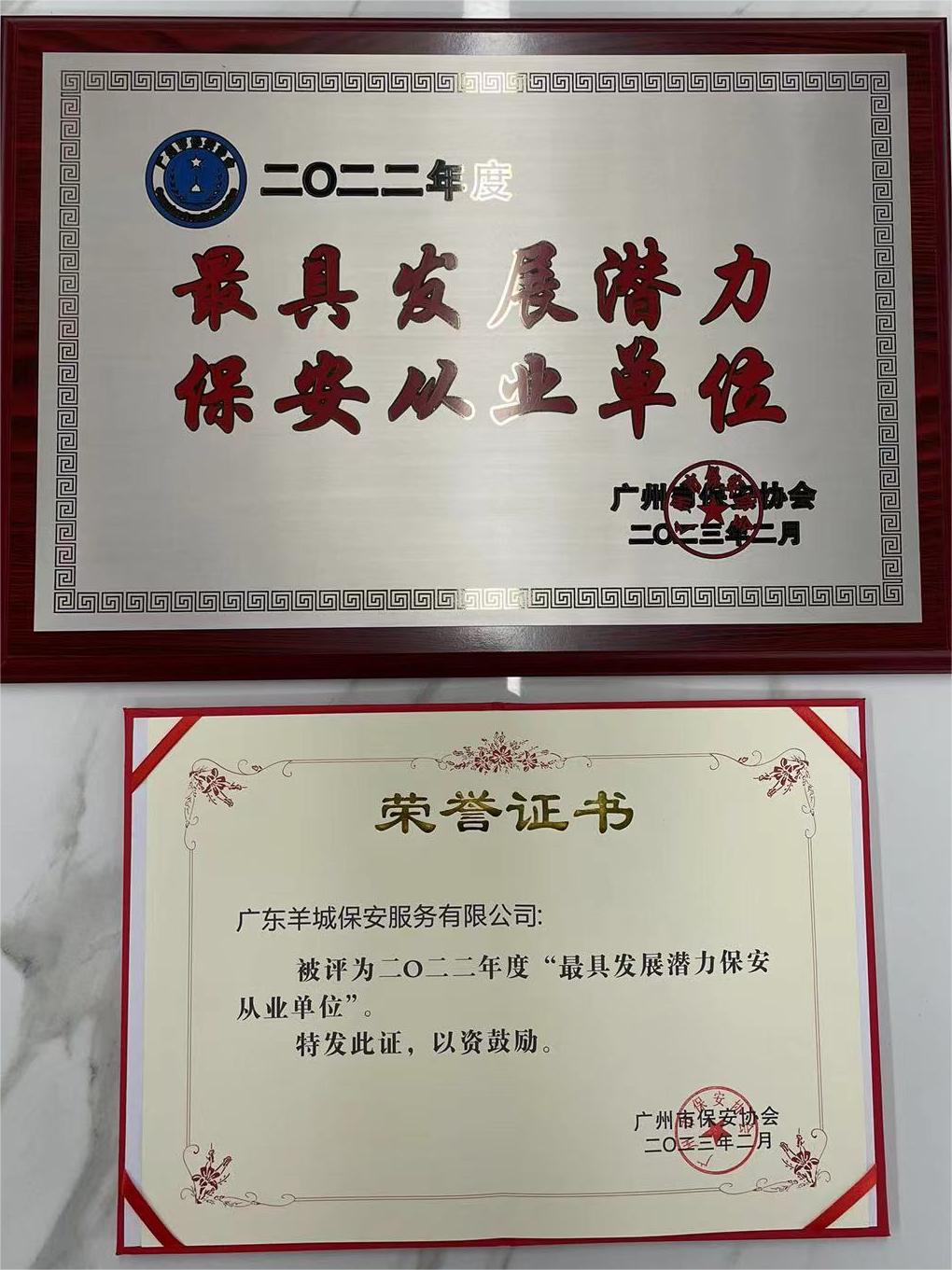 2023年,广州市保安协会表彰2022年度保安行业先进集体,羊城保安公司荣获“2022年度最具发展潜力保安从业单位”荣誉称号。
